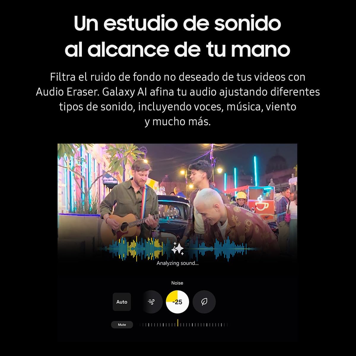 - Filtra el ruido de fondo de tus videos con Audio Eraser. Galaxy AI ajusta sonidos como voces, música y viento.